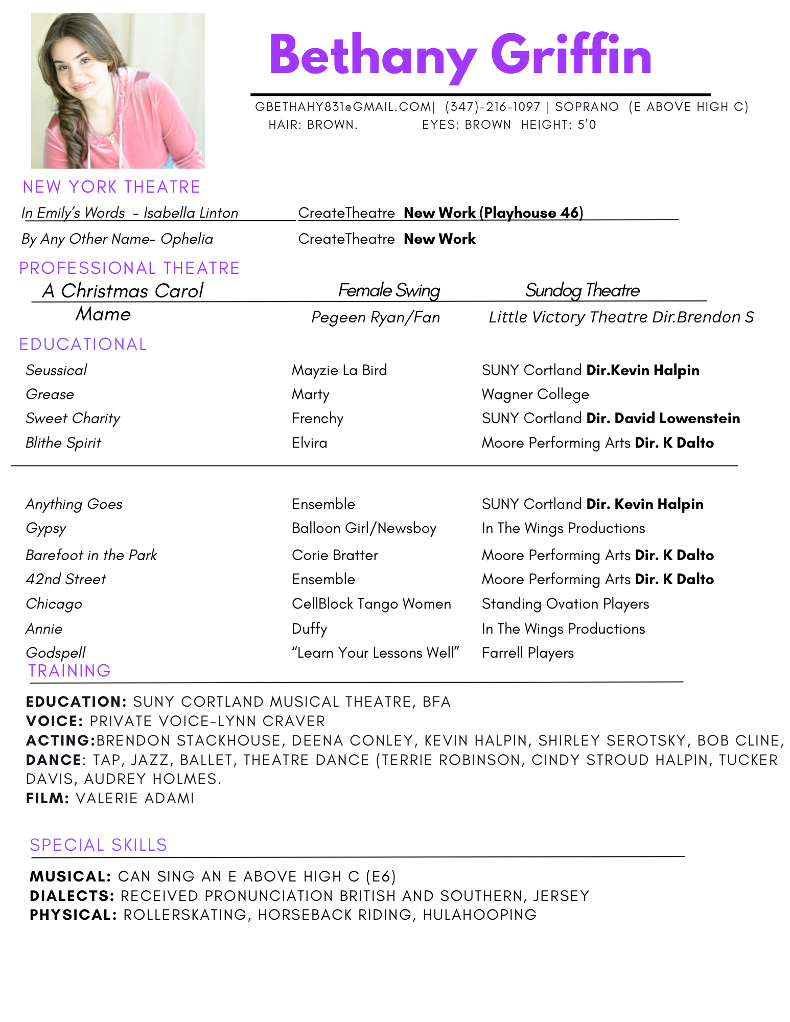 Bethany Griffin is based in Staten Island New York, and recently just graduated SUNY Cortland with her BFA in musical theatre! Bethany grew up around a musical and theatrical family and around a lot of artistic creative people,so she prides herself on the beauty of theatre and performing as a whole. She is very dedicated to creativity and professionalism. Fun facts about her are that she loves to do yoga, meditation, horseback riding, loves bohemian fashion, and pop/rnb music!